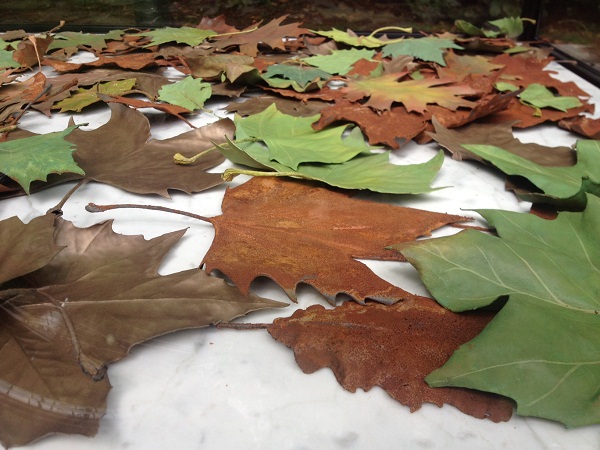 “These leaves are painted and have thin layers of metal added, so they look realistic but at the same time have become imperishable. This work illustrates a modern, romantic and nostalgic perception of nature and our desire to organise, conserve and hold on to it.”