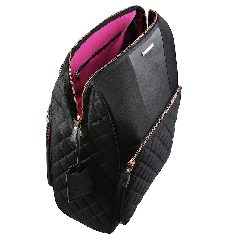 - Stylish 600D PU outer shell with faux leather inserts and rose gold detailing.