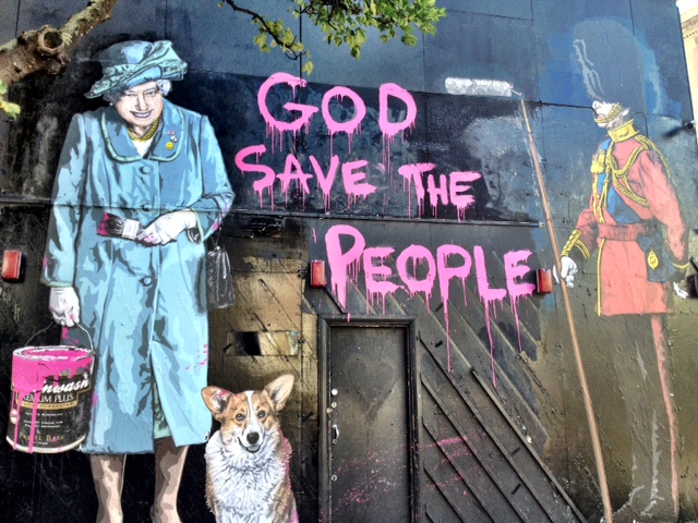 Even with all this space, the art work is plastered across the walls outside the building, proudly displaying the cheeky slogan, ‘God Save the People’ as thought our Liz had painted it herself.