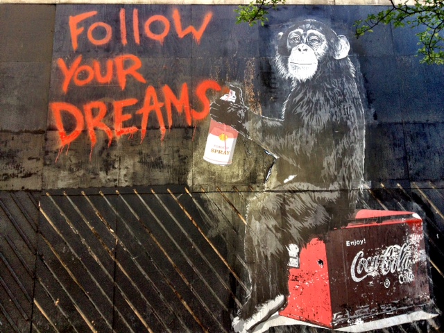 If you watch the documentary this guy is the guy who decided he wanted to film the whole new street art scene. Banksy described him as absolute crap and as having no artistic talent and yet everyone eats him right up. It’s hard to know where to draw the line with art really, what is art? Is this art because it’s artistically pleasing? Maybe, or should he have some sort of meaning behind his “doing what he likes” style. Is it art merely because everyone claims it to be. Who knows?