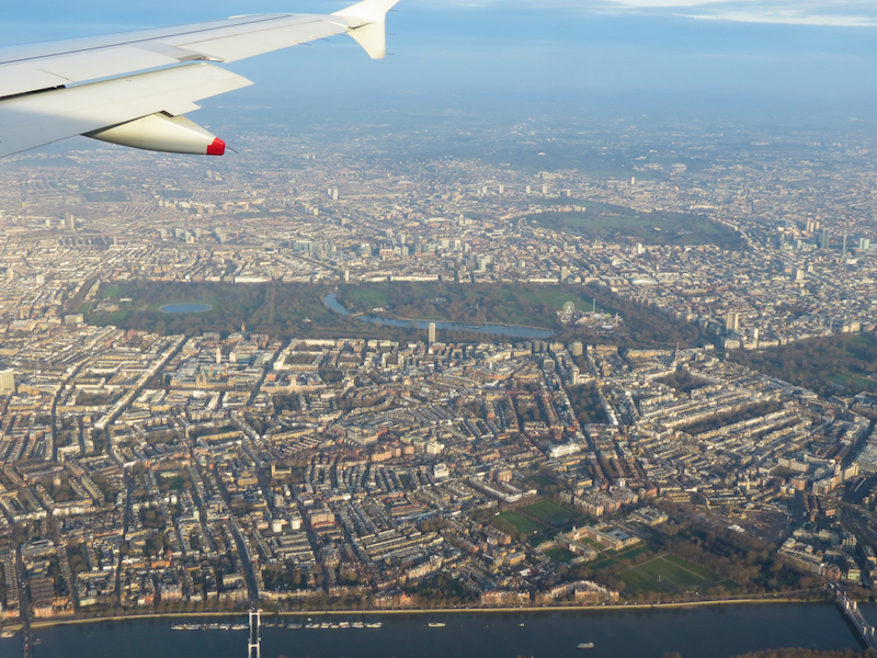 A patchwork of fields in every shade of green spread out for miles around and it’s a shock to see just how far the countryside spreads. As we get closer there’s the tiny squares of houses that look so neat and organised from up in the air. I keep my eyes peeled for swimming pools in gardens and get excited every time I see one. It’s a game I used to play with my brother when we were kids and believed only famous millionaires had swimming pools and we thought we must have spotted the homes of movie stars.