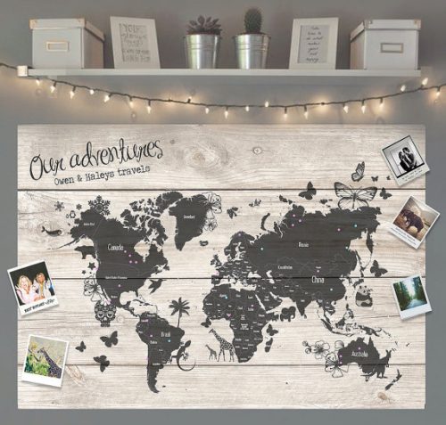 A customised and personalised World Map Pin Board with your name on, which is perfect for tracking your adventures with colourful pins. You could add photos after each trip and over time create a world map of travel memories.