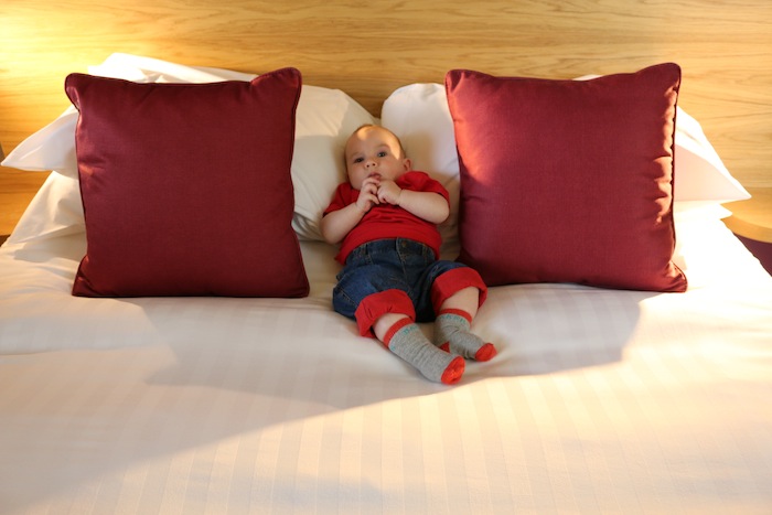 I recommend making ‘DIY baby friendly play areas’ with all your towels, pillows and blankets and look into hotels that have baby equipment.