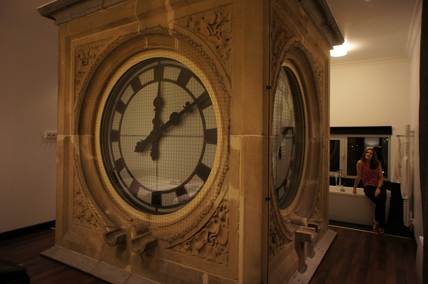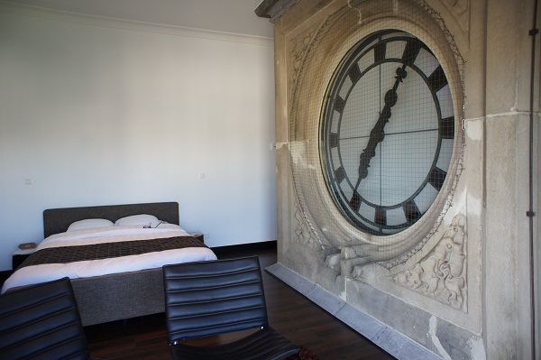 The hotel room, designed by Tazu Rous, is built around the clock tower at St Peter’s Railway Station in Ghent, Belgium. The clock, originally built in 1912, stands at 75ft high and has been an iconic landmark in Ghent ever since.