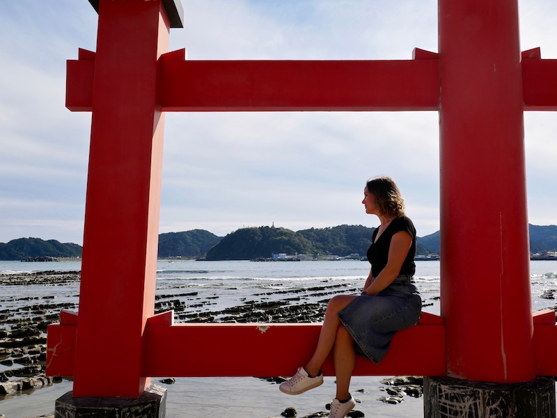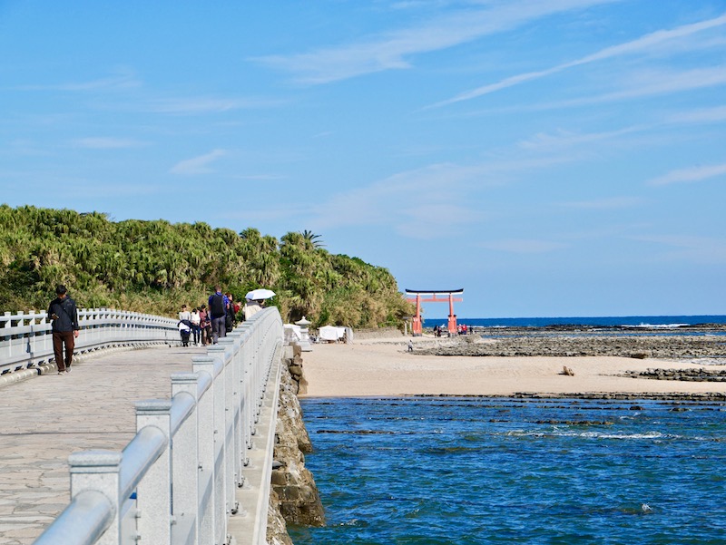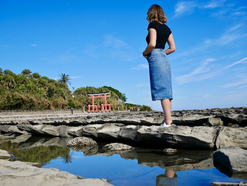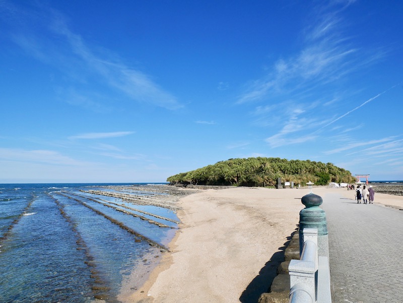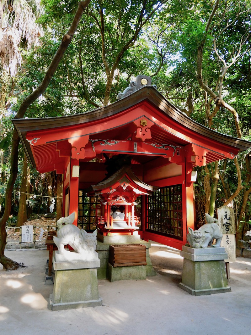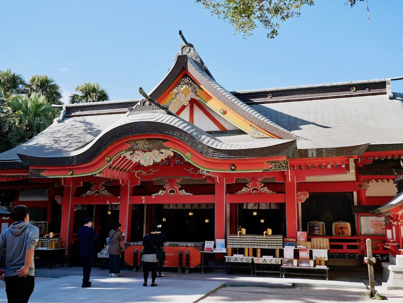 Aoshima is a tiny island connected to the mainland by a bridge. It has white sandy beaches and a subtropical jungle at the center and you could easily walk around the shore of the island. We walked under Torii Gate and through the dense trees into the centre to find Aoshima Jinja, a beautiful and colourful shine. It was fairly busy on the little island but the peaceful silence in the trees was intense. Stepping into the forest was like walking through a doorway into a different room and the door shutting behind you. The trees instantly blocked the noise of the crashing waves and the buzz of people all around.