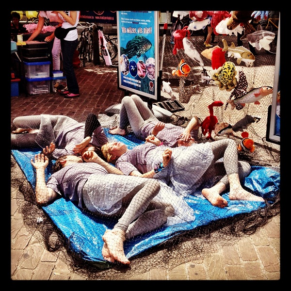 Students making an artistic demonstration against over-fishing and eating responsibly.