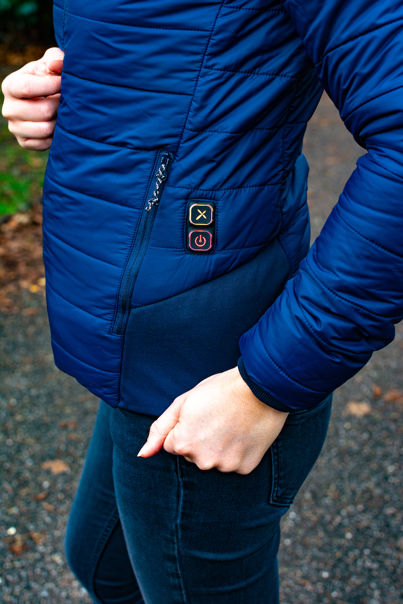 There’s an ultra thin heating element running through the jacket between the inner and outer layers. You can just about feel them through the inside of the jacket but you’d barely notice they’re there. The heated zones are in the front and the back and you can choose to heat just one zone or both. The front panels are particularly wonderful because they cover the pockets and keep your hands warm (yes, that’s why I have my hands in my pockets for most of these pictures!)