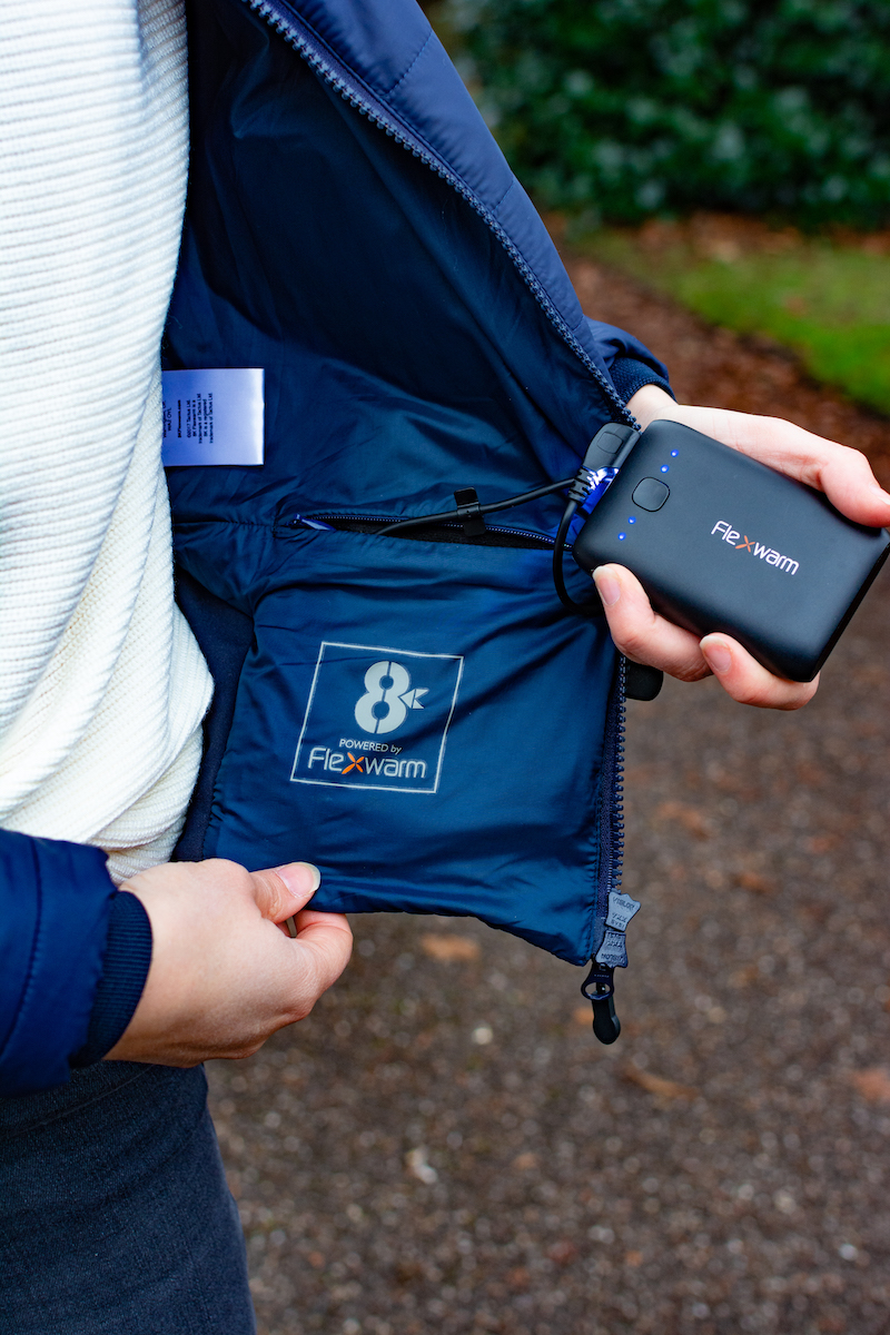 The 8K Flexwarm Heated Jacket is powered by a powerbank which slips into an inside pocket and connects to the jacket via USB. You do notice the powerbank in your pocket, it’s a bit like having a small phone in there, so it’s not too heavy and you quickly forget about it.