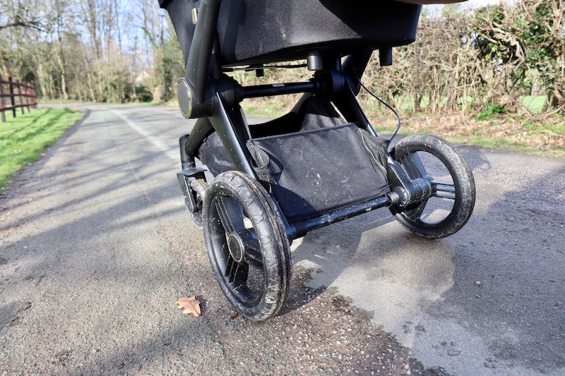 Not only does it look nice but all the materials are great quality so I don’t think it’ll look shabby and old within a year (which is what happened with our Mountain Buggy). I feel confident chucking it into the boot of the car and going about our everyday lives with a boisterous family! The older boys ride on it, they also like to push it and have the odd collision with a wall and the shopping basket is always spilling with heavy bags! I don’t need to worry about the chassis scratching easily and I’ve found it to be really easy to remove the seat and shopping bag and hose the pushchair down when it gets muddy.