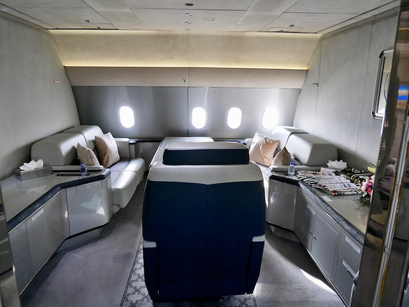 When we arrived at the airport we could see a little plane waiting for us. It was a little 16 seater and we all assumed we’d be boarding it. To the right there was an enormous plane that looked like a standard plane you’d share with hundreds of other people. I could not believe it when we were ushered towards this plane and boarded into a living area I could quite happily move into. There was a bedroom with a king sized bed, a living room, a huge living and dining area, an area with plush leather seats and proper bathrooms.