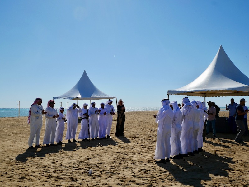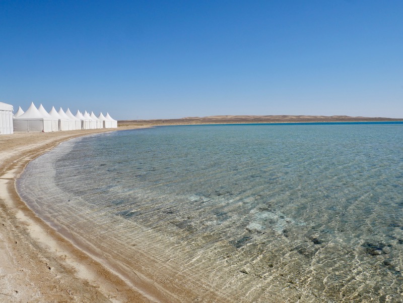 We flew over the desert for an hour and a half and were then collected by a long line of fancy 4x4s that drove us through the sandy landscape. After miles of nothingness we arrived at a large marquee (a bit like a very posh wedding marquee) where we were served Arabian coffee, an impressively grand buffet and had our first sighting of Saudi Arabia’s Red Sea and the stunning blue waters and golden sand.