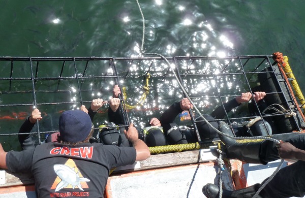 We entered the cage, which was attached to the boat, in nervous groups of five. I somehow ended up in the first group and we spent the first few minutes in the cold water practicing the drill for when a shark arrived. We had no snorkel or scuba equipment and simply took a deep breath and let the weights pull us to the bottom of the cage whenever a shark was close by. It was easy to stand on the bottom and hold onto a red bar that you rest your chin on to make sure your face is at the front of the cage to get a good view.