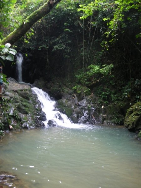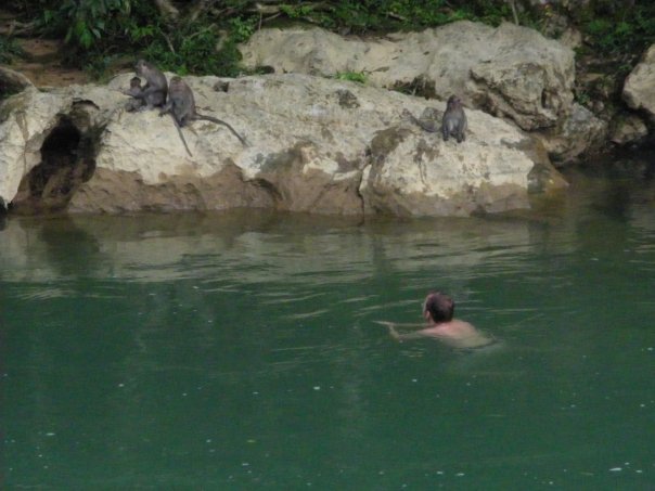 We stopped at some more waterfalls on the way back to the lodge and then Sam and I sat by the river drinking beer. After about half an hour we noticed a little monkey on the other side of the river. There were massive rocks there, about 8 meters away that led up to the jungle behind.