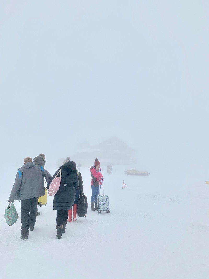 I could literally see nothing around us but white. Up, down, left, right, backwards, forwards. It was just all white. The wind whipped past my face like a brutal slap and it pushed my body in whichever direction it chose. In front of me there were a few people dragging suitcases through the deep snow and it was this scene that really tickled me. They looked like they should have been strolling through the airport, not lumbering across a snowy mountainside in search of…..well we weren’t even sure what we were in search of because we couldn’t see anything!