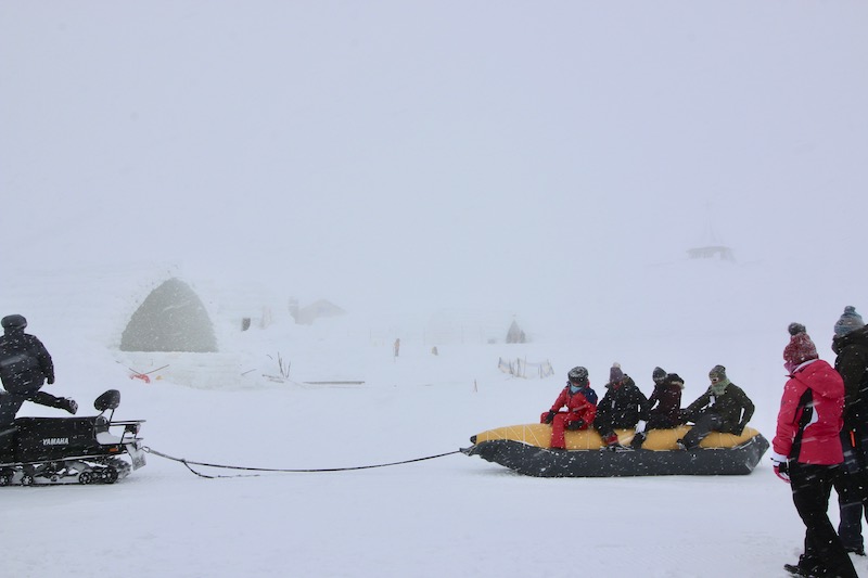 It turned out we’d arrived at a bad moment and 10 minutes later the wind had subsided and the sun was straining through the clouds. We could finally see a few buildings in the distance, the opening to the snow hotel, some snowmobiles whizzing around and a half constructed ice chapel which was still being built.