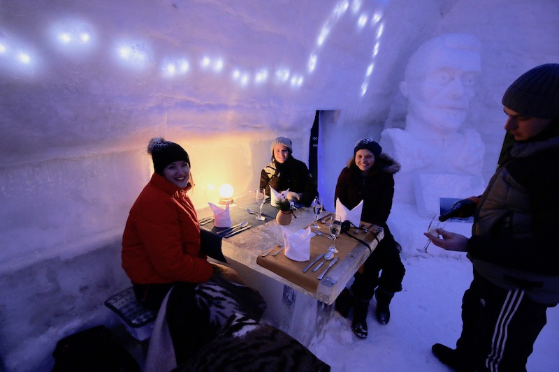 Before bed we had a magical dinner in the ice restaurant where we tucked into four steamy courses while wrapped in blankets and perched on animal furs to stop our bums from freezing! The food was delicious, and I don’t just mean ‘delicious considering we were in a building made from ice’, it really was incredible!