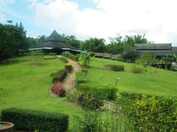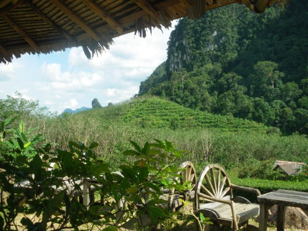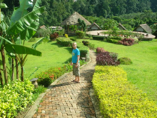 The boy led us through the gardens to our hut. The gardens seemed to go on for miles and a little brick footpath curved through massive, bright flowers and palm trees. In the distance there were huge limestone cliffs that towered into the clouds and through the trees I could just about see a river flowing through. It was so green and perfect it almost felt like an exotic version of Teletubbie Land.