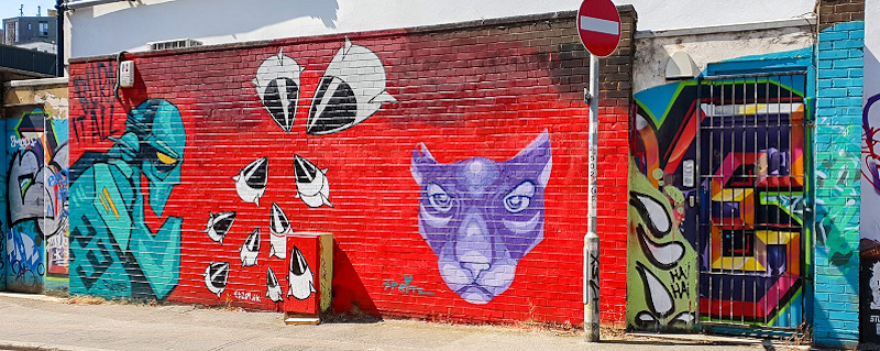 Graffiti is all over the place in Brighton, from terrible scrawls to huge pieces of art. Some of the coolest are on the communications boxes that are usually just painted a slightly dull green, One of my favourites is on the side of the Prince Albert pub. It is a brightly coloured montage of famous music stars with lovely punchy of colour.