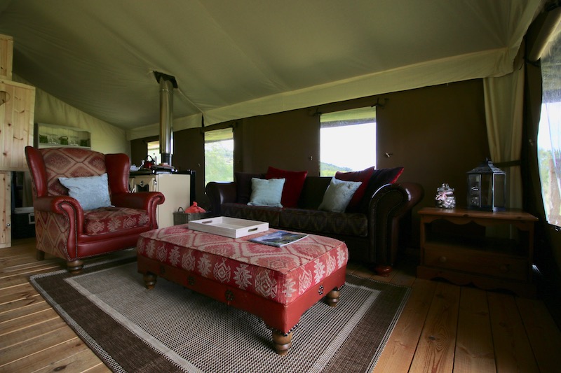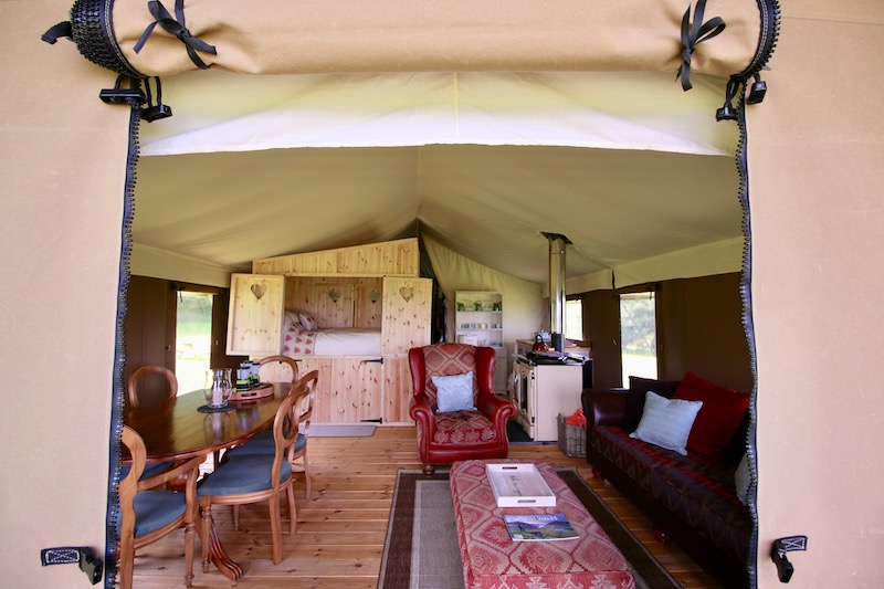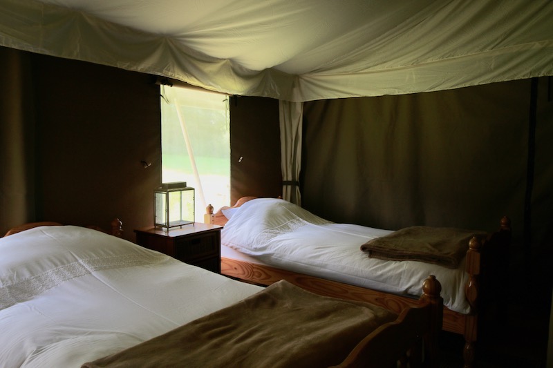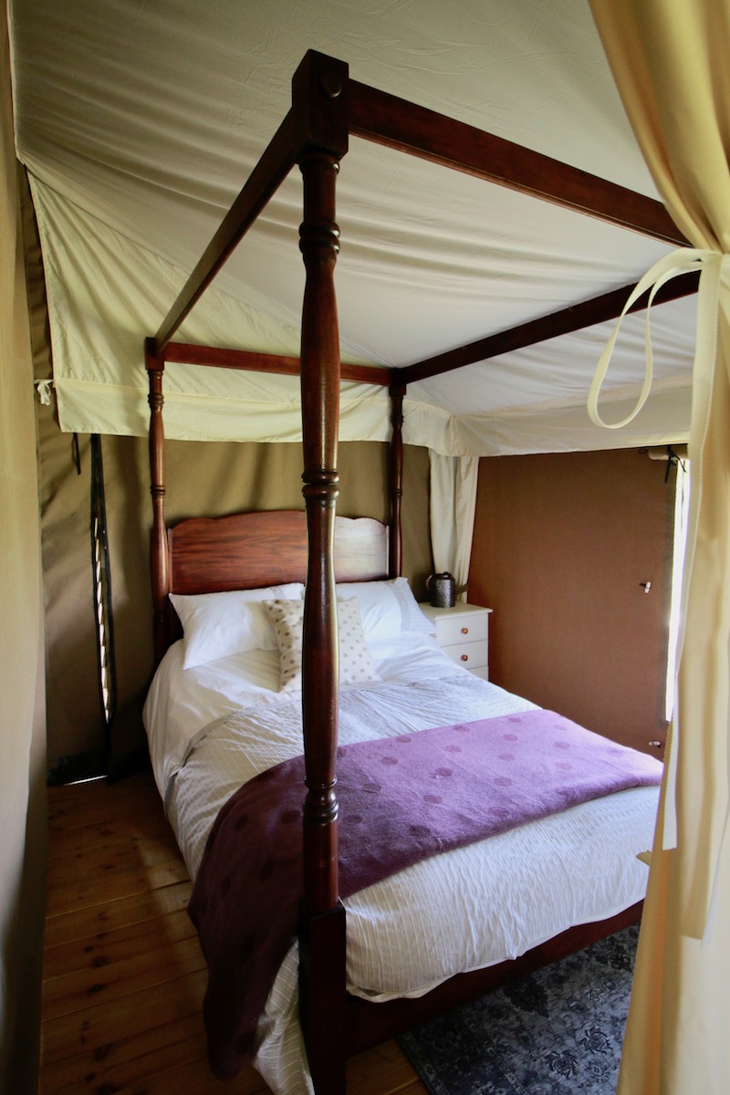 I knew this was going to be extra luxurious as we approached the huge safari tent. Victoria steered me away from the back door and towards the front entrance where an enormous raised veranda looked out over the countryside. Stepping inside the tent and you’re hit by that lovely, warm scent of wood. It’s outdoorsy but sweet and deliciously cosy.