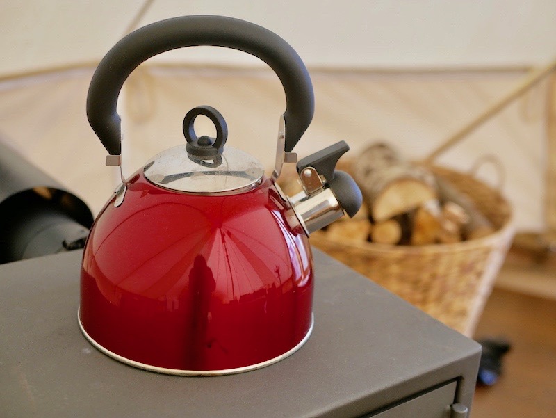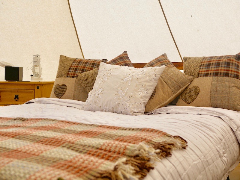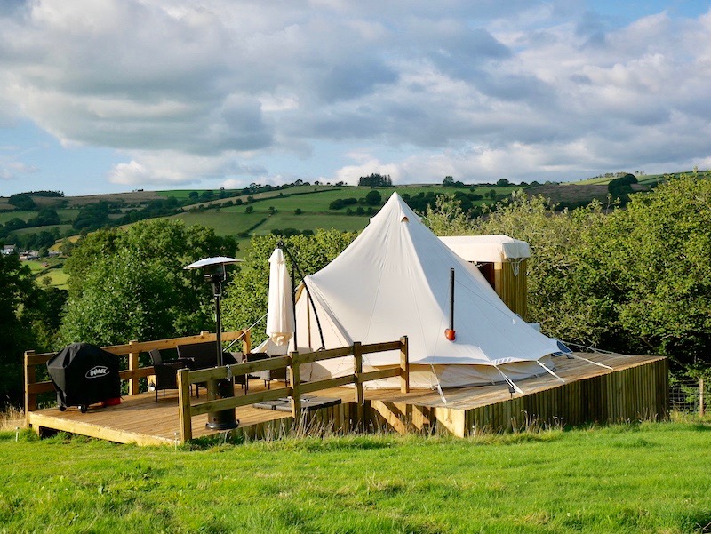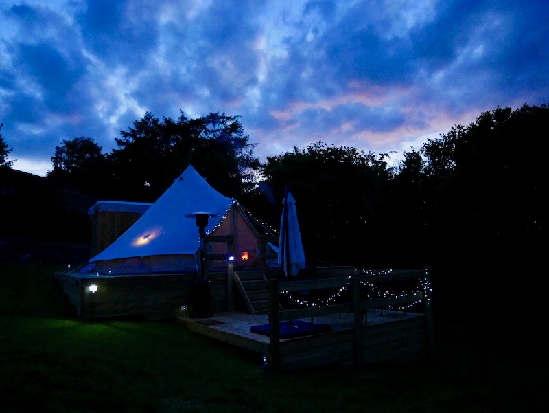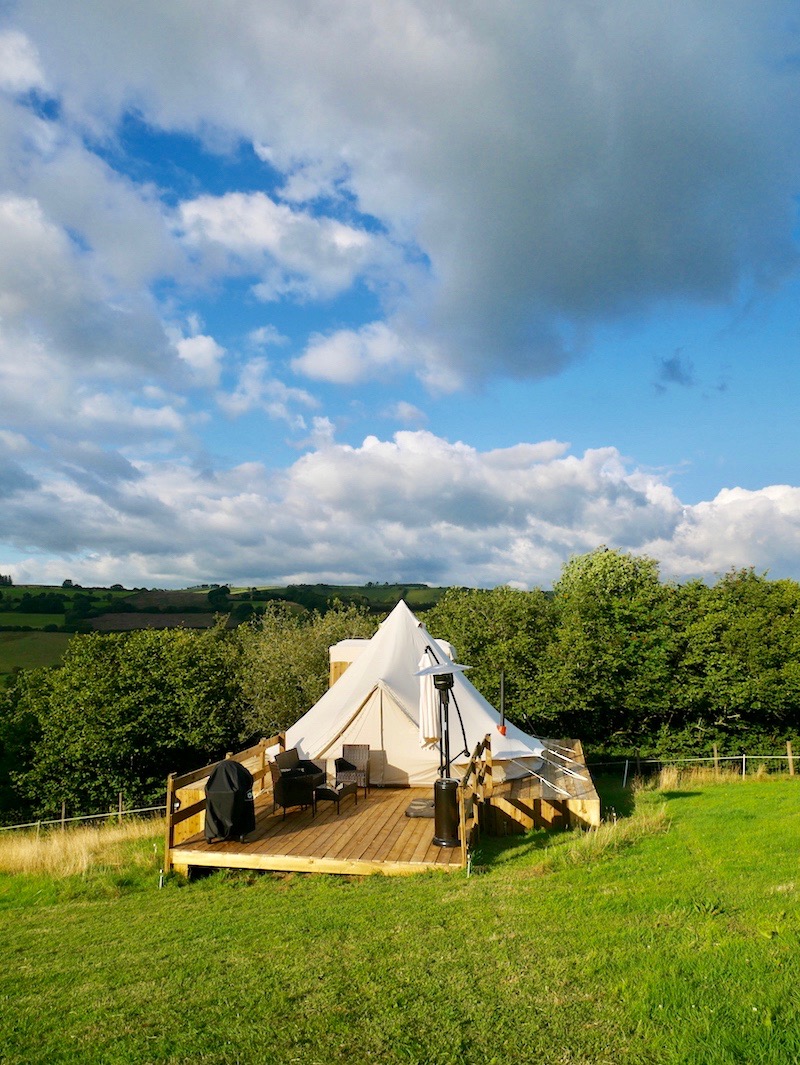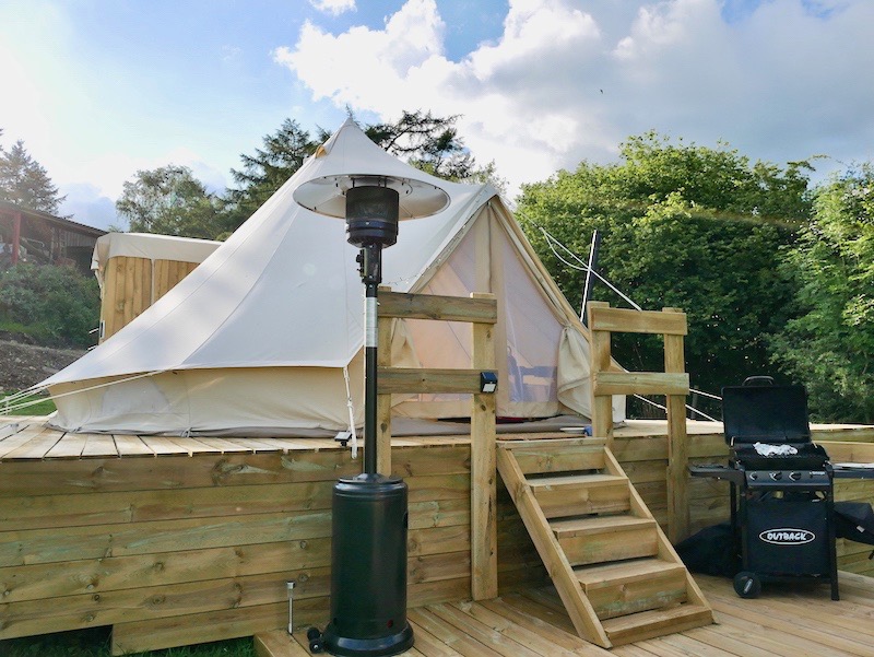 At Brandy House Farm, the two tents are pitched on a (perfectly even!) raised wooden platform, with a decked veranda looking out over the hills. If you ignored the comfy outdoor furniture, patio heater and gas BBQ then you’d probably think this was a regular bell tent…until you stepped inside.