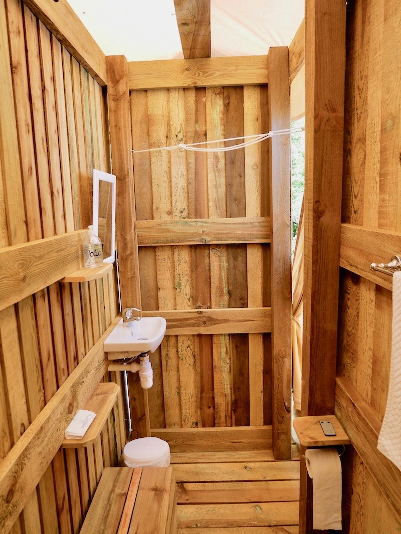 My eyes landed on the large wooden bed and chunky wooden furniture that was homey and inviting. A log burner and a basket of logs sat nearby and a dresser was filled with everything you’d need to cook up a meal on the BBQ outside. A spacious bathroom was at the far end with a hot water shower, wash basin and eco toilet.