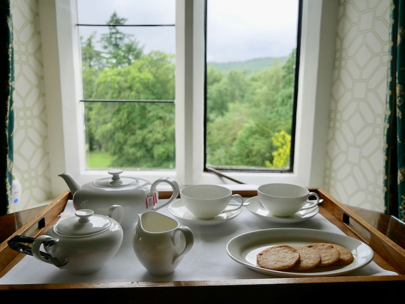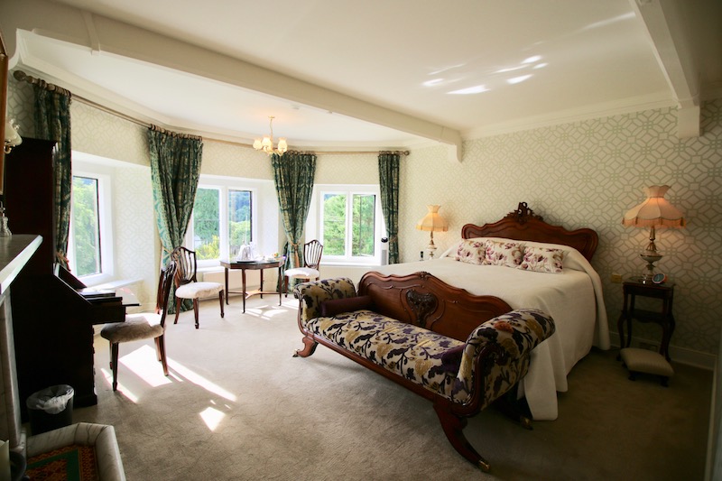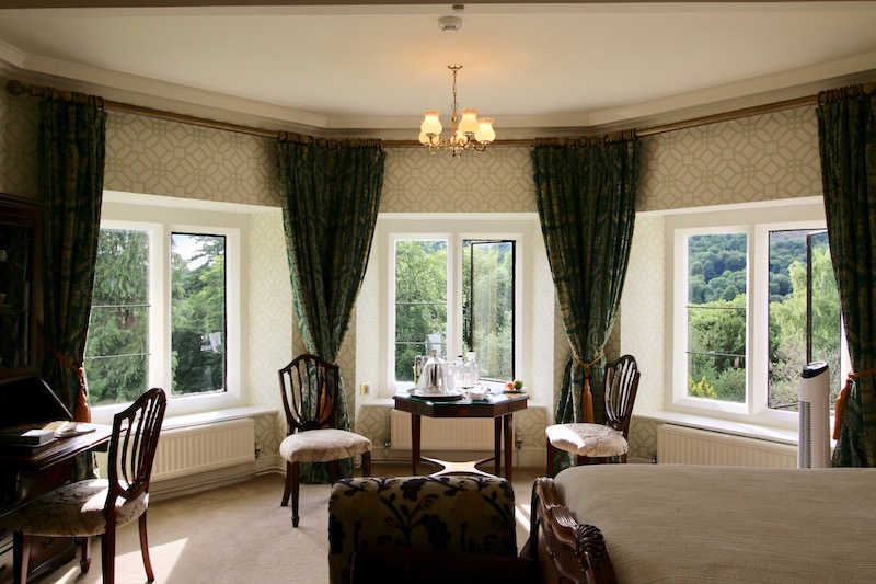 A chaise lounge sat at the foot of the bed and I sat there for a few moments, soaking in my room while I accidentally polished off that chocolate plate. I noticed the carpet was so thick I’d left footprints across the floor like it was a fresh blanket of snow. The views out of the huge windows led out across the gardens but I could see nothing but mountains and trees. It made me feel a long way from anywhere and as though this could be my home, a little retreat just for me.