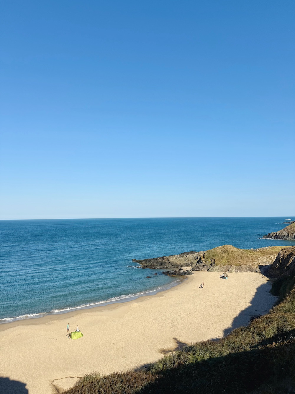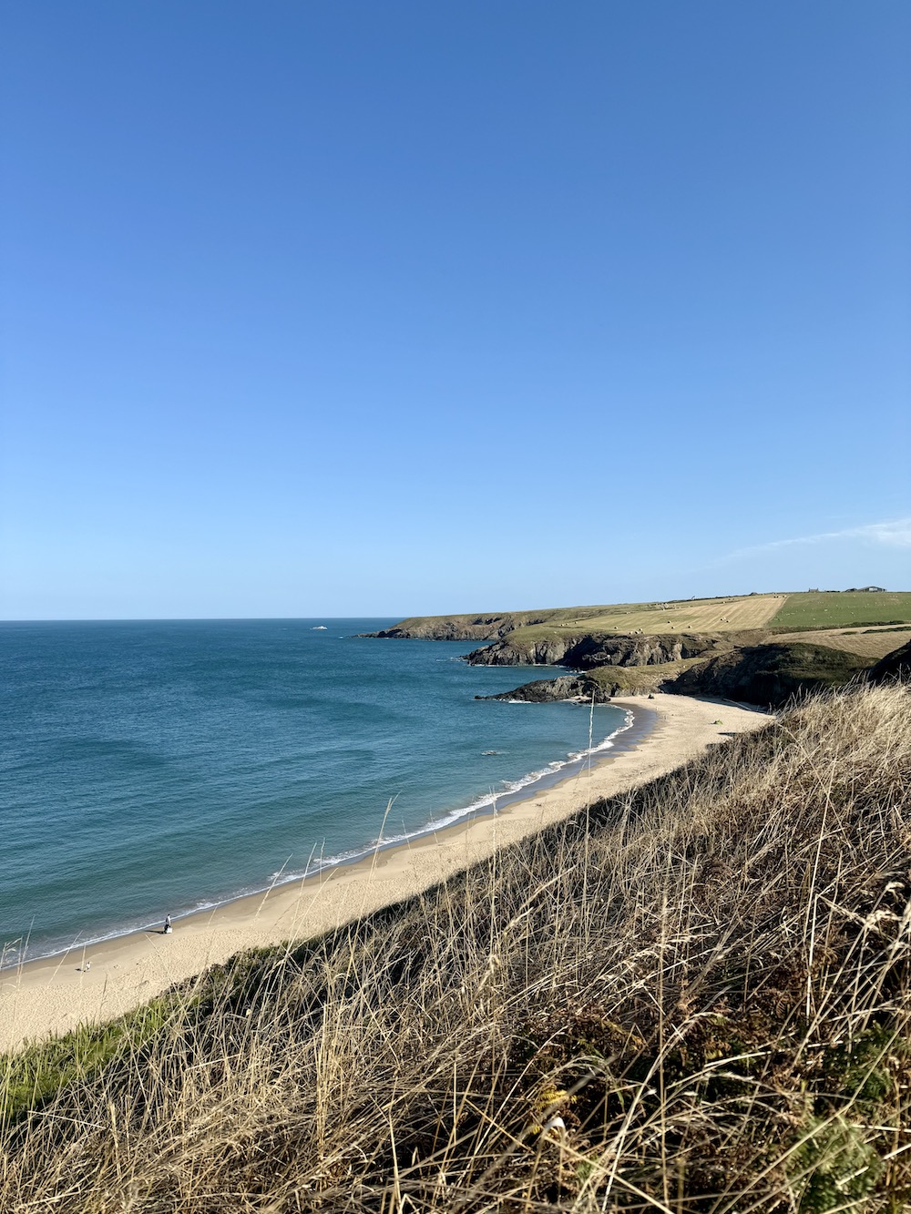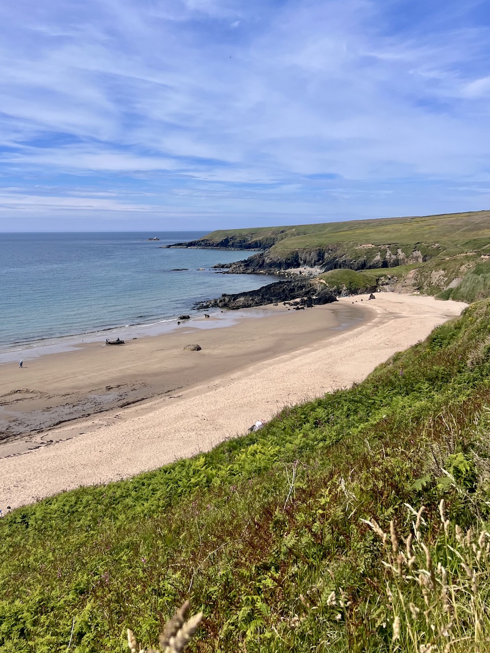 The bay forms a perfect crescent of pale golden sand, backed by steep grassy cliffs and rolling farmland. The contrast between the turquoise water and rugged green landscape feels almost Mediterranean on a sunny day. Yes really! Sometimes the weather in Wales  behaves.